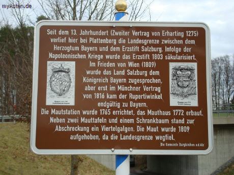 Wir beginnen unseren Marsch am besten wieder in Asten und gehen auf der Gemeindestrasse dann in Richtung Dorfen - etwa 1 km. Um dann in Richtung Eck abzubiegen und gehen hier auf diesen Kamm entlang bis zur Ortschaft Eck. Hier kommen wir nach dem Gehöft direkt an einem Steinkreuz aus Tuffstein vorbei, dieses Kreuz wurde hier hin versetzt und war einmal ein wichtiger Grenzstein, sein Standort war ursprünglich zwischen dem Mauthaus und der Niederhamer Kapelle. Wir folgen der Straße weiter und gehen in Richtung Plattenberg um dann links zur Ortschaft Plattenberg hinunter zu gehen. Hier treffen wir auf die oben abgebildete Hinweistafel.