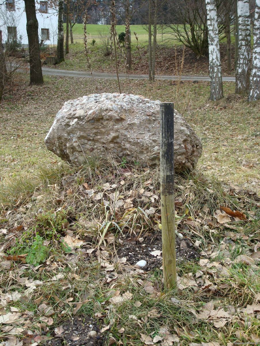 Unweit von der Hinweistafel ist dann ein Grundstückpflog und ein Schuttberg mit einem Stein darauf. Ob hier die Grenze war oderob diese sogar hinter dem Mauthaus vorbei lief (und damit das Mauthaus heute auf Traunsteiner Gebiet stünde) ist nicht unstrittig. Da ab 1816 alles bayerisch war, war es irgendwann auch unwichtig, wo genau die Grenze verlief.