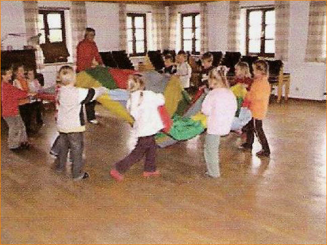 Innenbereich Wir verfügen im 1. Stock über einen Gruppenraum und einen Nebenraum mit dazugehöriger Garderobe, Kindertoiletten sowie Küche mit Büro. Im Erdgeschoss dürfen wir den Vereinsraum mitnutzen. Ferner dürfen wir im Pfarrheim den Saal als Turnraum nutzen.